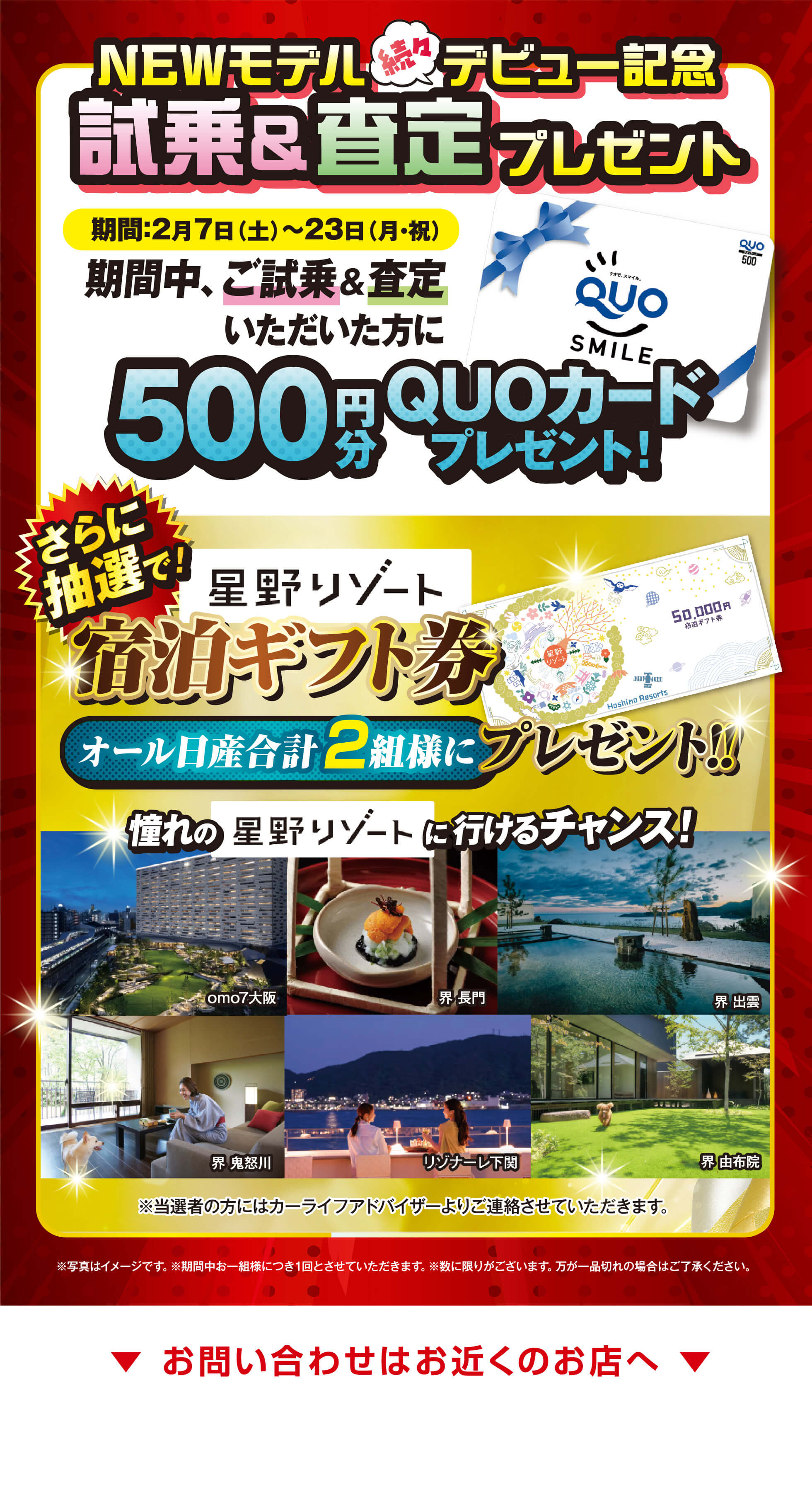 NISSAN 日産×決算 話題のNEWラインナップも見逃せない!! 超おトク!!今が買いドキッ!今年度最後の総決算! 岡山県下全店舗で開催!2/7(土)〜/23(月祝)